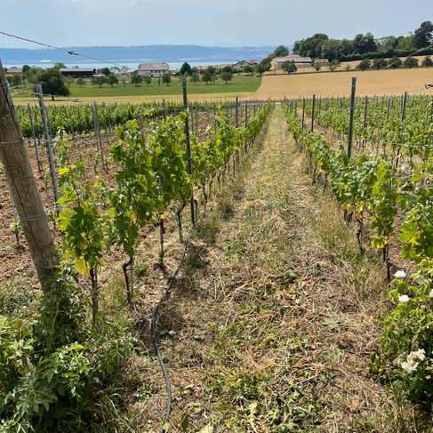 Following our tasting, we drove a short distance to visit the Domaine De Gourmandaz vineyards. Workers were busily tending to the vines when we arrived. The vineyards gradually sloped downwards towards Lake Neuchâtel, providing excellent water drainage for the vines. Too much water could lead to increased fungal growth and vine overproduction leading to diluted, less intensely flavored grapes. The view of the lake from the vineyards was spectacular, as the blue and green lake colors reminded me of the Caribbean. As a side note, if you ever scuba dive in Lake Neuchâtel, you should be aware that there is an extremely scary underwater statue of a shark located at the bottom of the lake. It’s worth a Google search:-)